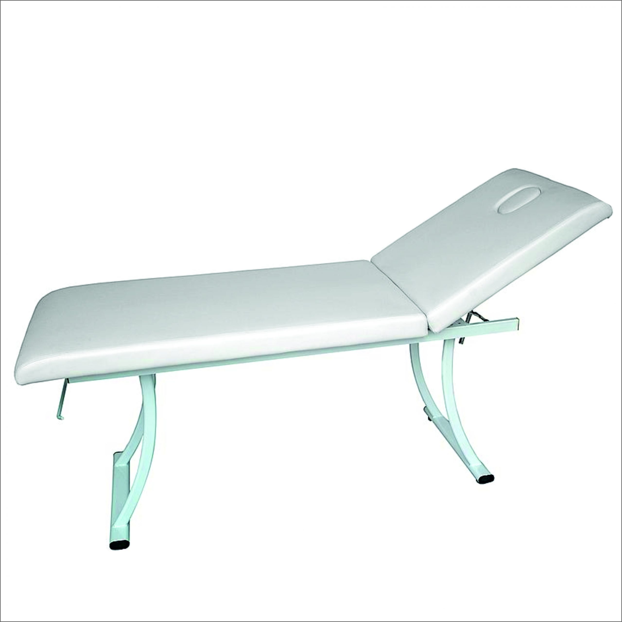 Camilla fija multifuncional de 2 cuerpos de estructura robusta. Inclinación del respaldo ajustable manualmente con agujero facial. Tapizado blanco en PVC fácil de limpiar. Portarrollos incorporado.